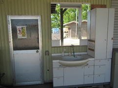 施設入り口には専用の手洗い所が設けられている。流しの右手には、手洗いの方法を掲示している。