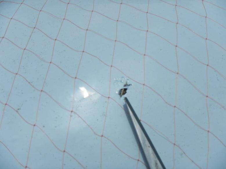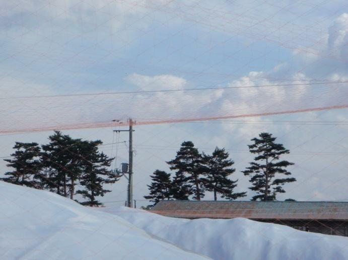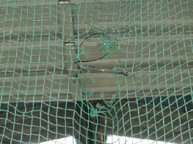 防鳥ネットの上にテグスを張り、カラスの侵入を防ごうとしたが