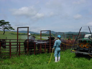放牧牛への外部寄生虫駆除剤の噴霧