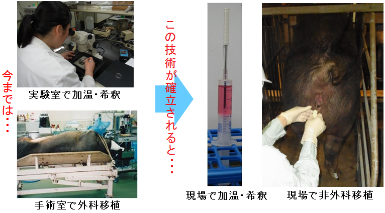 通常の豚における胚移植では、実験室内の顕微鏡下で加温・希釈した胚を、手術室で外科的に移植するが、習熟を要する。そこで、現場で簡易に加温・希釈し、非外科的に移植することにより、生産現場で使用可能な胚移植技術を確立する。