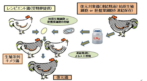 鶏の雄性遺伝資源は凍結精液として、また、雌性遺伝資源は胚盤葉細胞もしくは始原生殖細胞を凍結して保存することができます。いずれかの雌性遺伝資源を利用して、生殖系列キメラ鶏を作出し、凍結精液を用いて鶏を復元することが可能です(下図)。