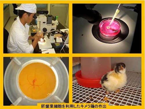 キメラとは、2個以上の胚に由来する細胞集団から形成された個体を意味します。キメラが畜産分野に利用できるのは、生殖系列(精巣と卵巣)が置き換えられた場合(生殖系列キメラ)に限定されます。キメラは胚盤葉細胞もしくは始原生殖細胞から作出できます。これらの細胞を凍結することで永久保存も可能となり、卵をあまり産まない貴重品種を産卵率の高い品種を使って増産できる可能性があります。