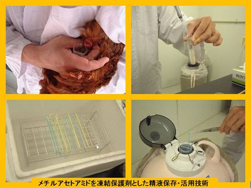鶏における凍結精液の利用は、凍結保護剤除去の手法が煩雑であること等、主として労力面から普及が遅れていました。家畜改良センターでは、凍結保護剤にメチルアセトアミドを用いる手法を開発し、大幅に凍結精液技術の簡便化を達成しました。