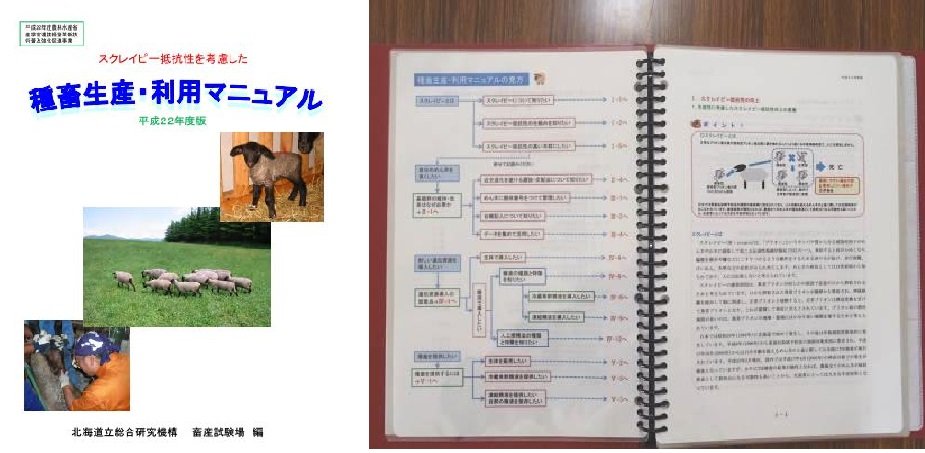 スクレイピーに対する抵抗性の高いめん羊の造成を目的として、平成22年度に北海道相好研究機構畜産試験場において「スクレイピー抵抗性を考慮した種畜生産・利用マニュアル」が作成されました。(このマニュアルは農業改良普及支援事業産学官連携経営革新技術普及強化促進事業によって作成されたもので、十勝牧場も作製に協力しています。)