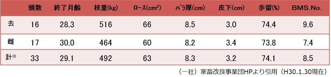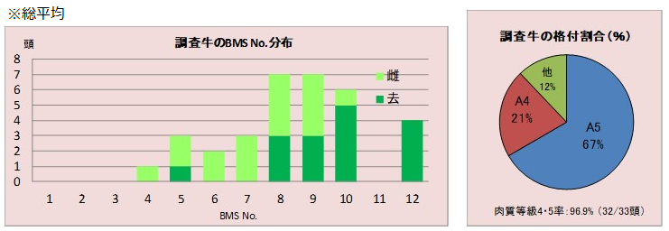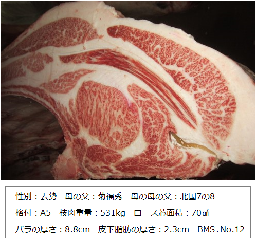 現場後代検定の調査成績において、全33頭の平均BMSが8.5と良好であり、特に去勢牛のBMSの平均が9.6と同期牛の中で最も優れていました。また、調査牛の96.9%の牛が4等級以上に格付され平均枝肉重量が492kgを記録するなど肉質や肉量ともに改良が期待される種雄牛です。