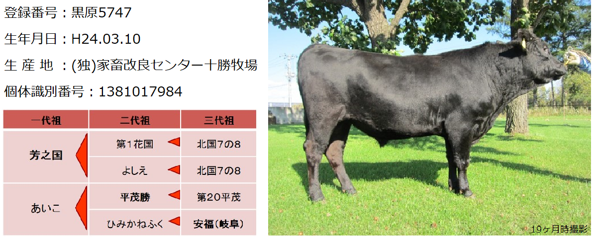 「愛之国」は、これまでに「 勝忠福 」や「 光彦 」といった優秀な種雄牛を作出してきた当場産「 あいこ 」に「芳之国」を交配して生産した種雄牛です。