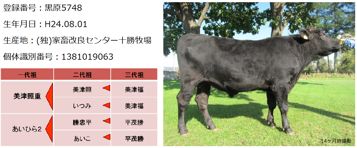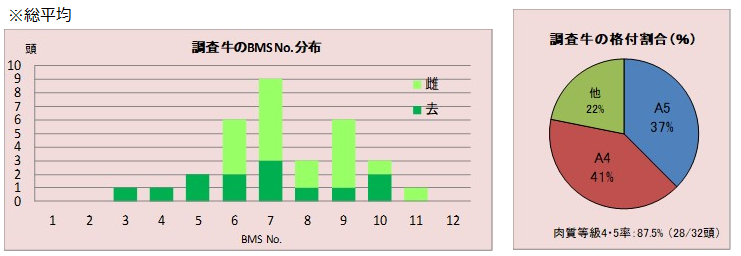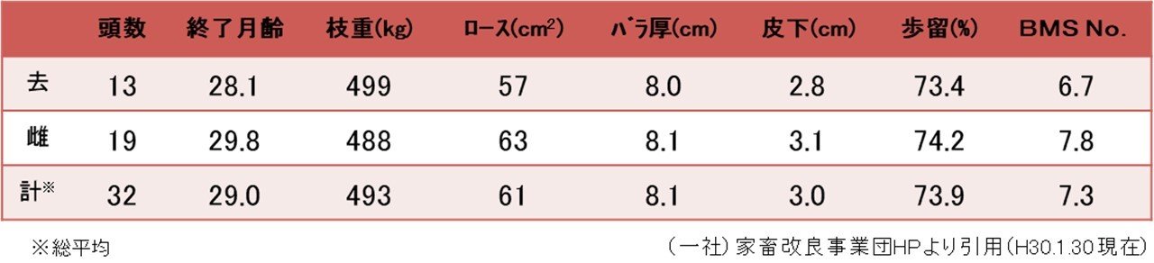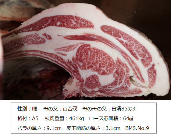 現場後代検定の調査成績において、全32頭の平均が枝肉重量493kgと良好であり、特に去勢牛の平均が499kgと優れていました。また、脂肪交雑はBMS.No.7.3を記録し、調査牛の87.5%が4等級以上に格付されるなど質量兼備で安定した上物率を示し今後の活躍が期待できる種雄牛です。