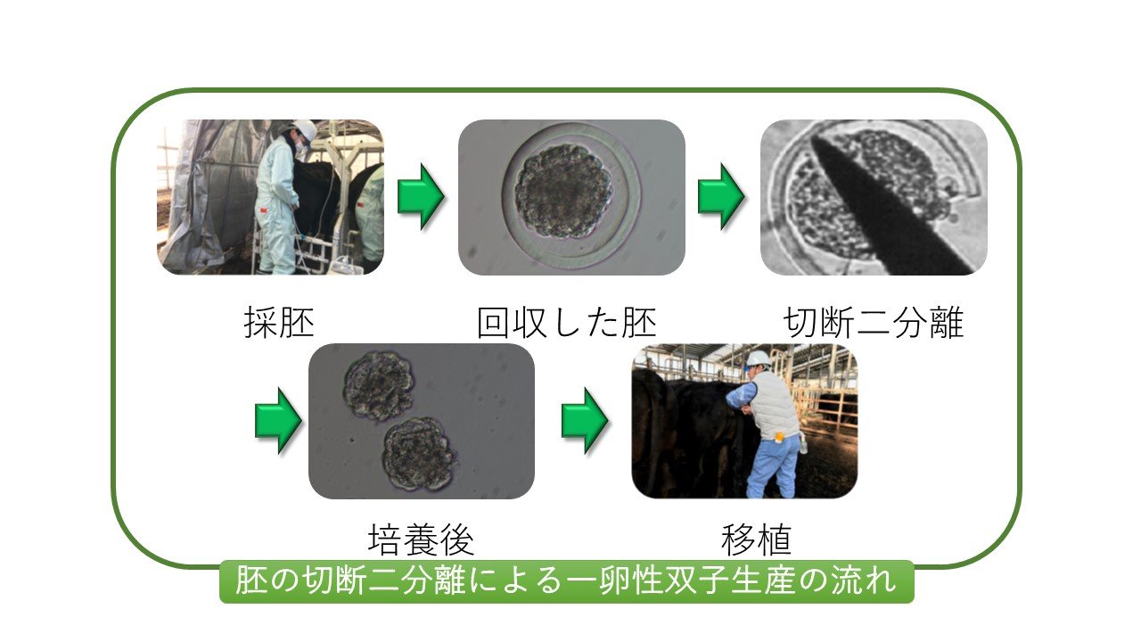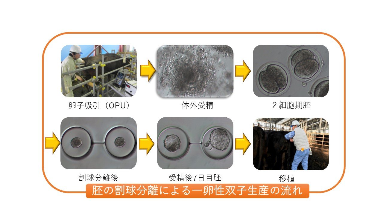 OPU-IVP技術は、雌牛の生体(卵巣)から吸引した卵子に体外受精を行うことで胚を生産する手法ですが、この技術と胚の「割球分離技術」を組み合わせることにより、一卵性双子の生産に取り組んでいます。
