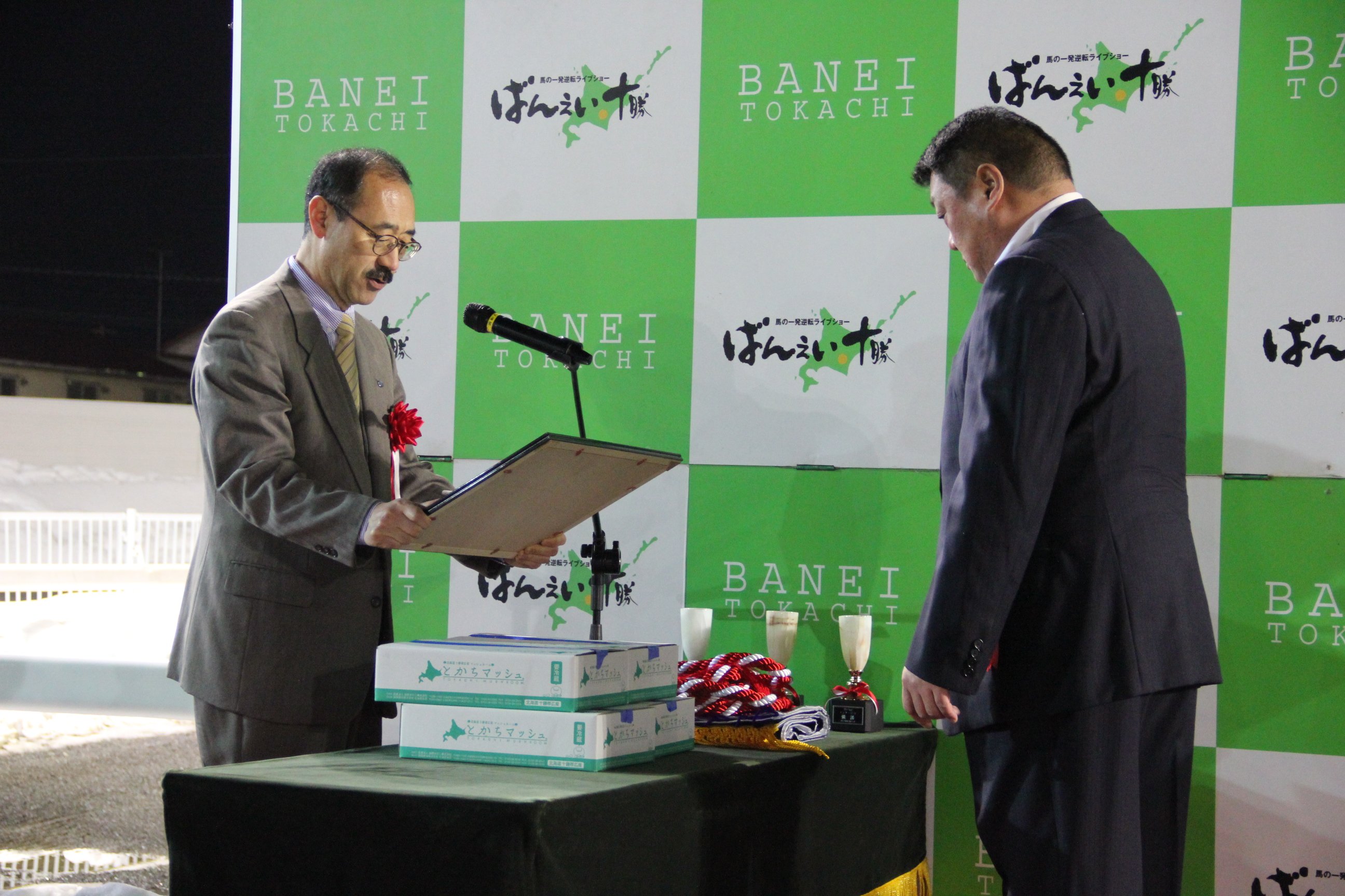平成30年3月4日に帯広市帯広競馬場にて、第49回イレネー記念が開催されました。イレネー記念は、イレネー号(ペルシュロン種)の功績を記念したものです。イレネー号は1910年にフランスから導入され、十勝種馬牧場(現家畜改良センター十勝牧場)で種牡馬として活躍し、十勝の馬産の礎を築いたとされています。今回十勝牧場長より、勝利馬「カネサダイマオー号」の馬主へ賞状とイレネー号の写真額を授与しました。