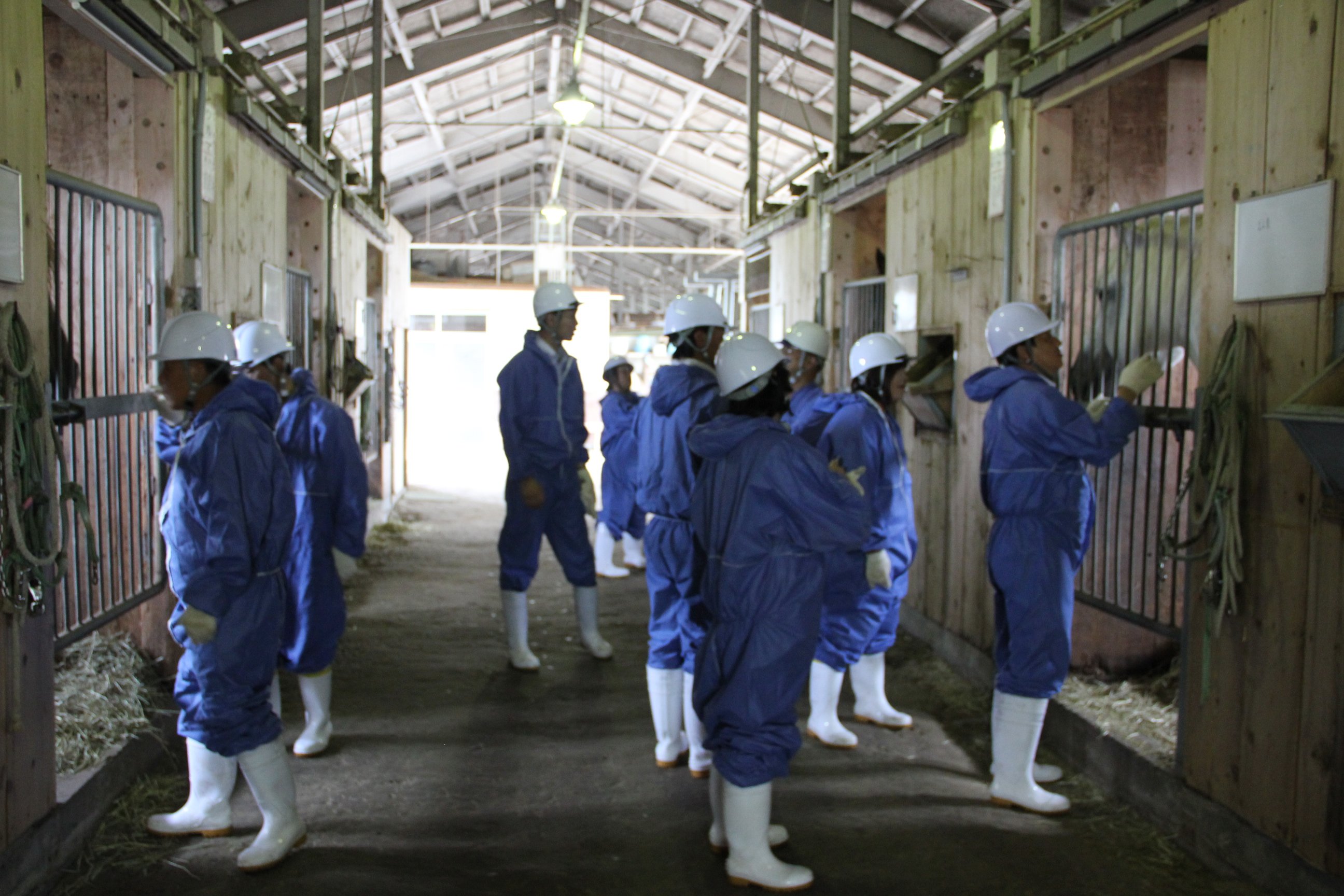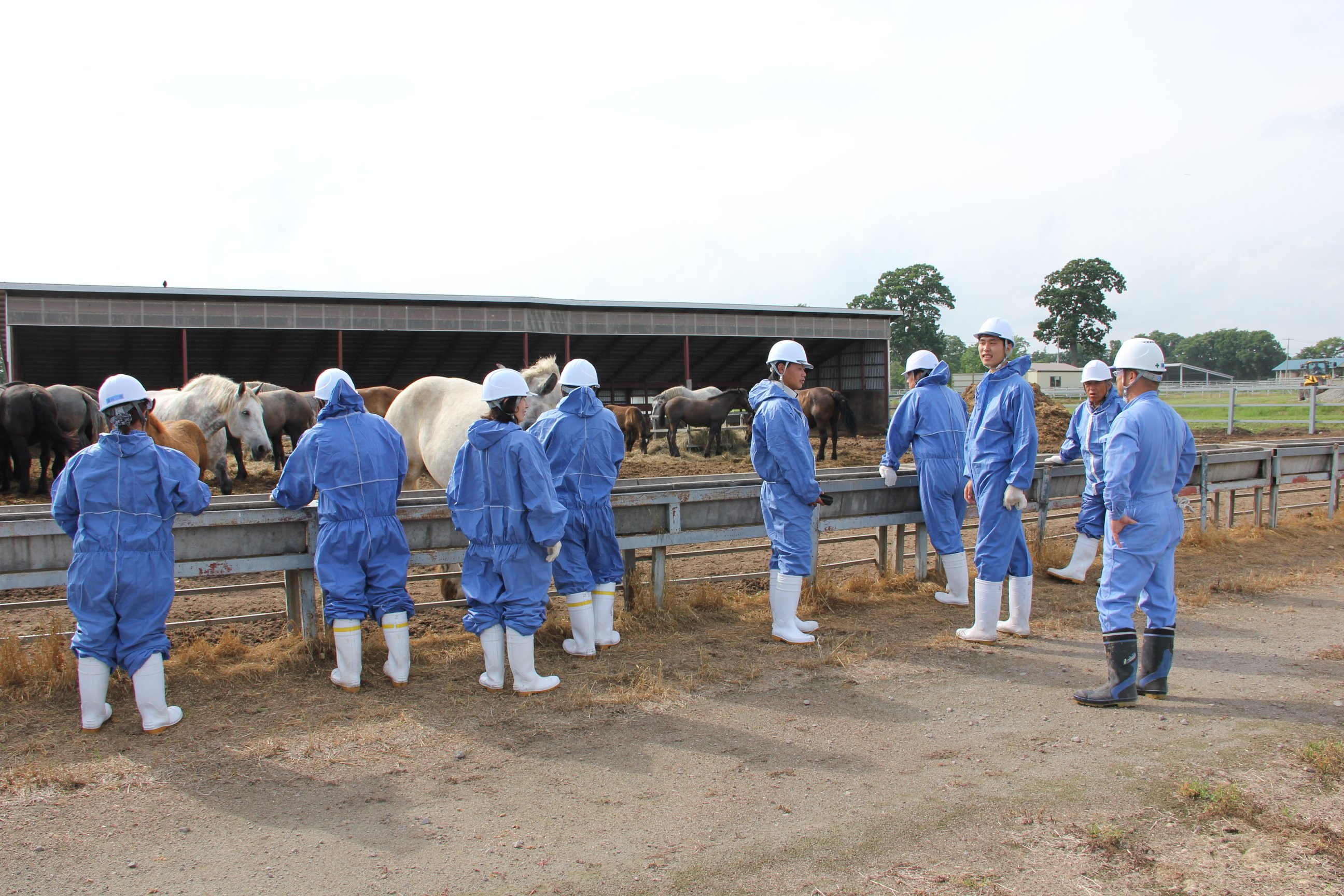 阿蘇重種馬生産部会の方々8名が7月24日来場され、当場繋養の種雄馬や馬施設などを見学されました。当場から配布され現在、熊本で活躍している馬の父となる種雄馬など熱心に見学しておられました。