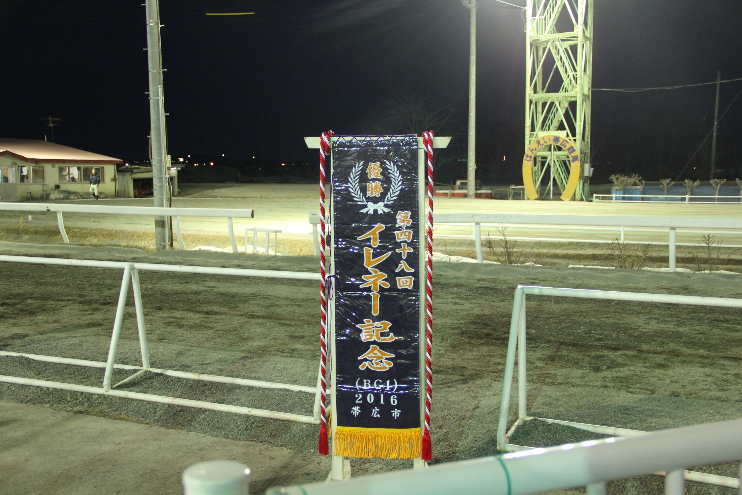 平成29年3月5日に帯広市ばんえい競馬場において第四十八回イレネー記念が開催されました。全10頭が参加し優勝した勝利馬「ホクショウムゲン」号馬主に対して場長より表彰状および記念品(イレネー号の写真額)を授与しました。