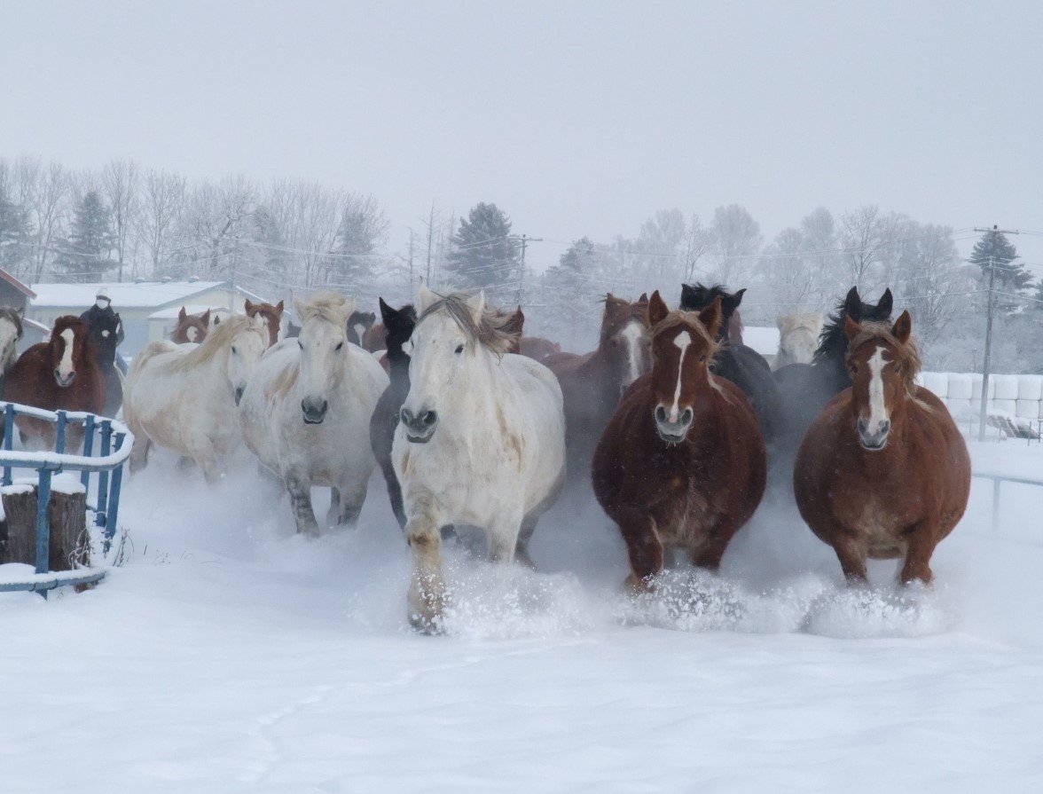 運動している馬たちは、毛色が茶色のブルトン種、白・黒・灰色のペルシュロン種という品種の重種馬です。分娩を控えた馬たちのなかには、体重が1トンを超えるものもいます。