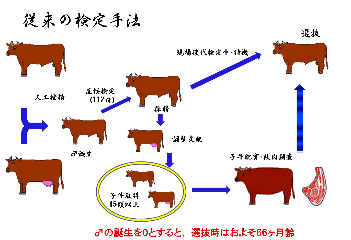 肉用牛の種雄牛は、通常、発育の良さ、肉量、肉質等の能力を調査し、優れたものが供用されます。調査する項目のうち肉量、肉質等は、と殺後でなければ調査することが出来ないため、その牛自身を調査するのでなく、一般にその牛の後代牛を多数生産して肥育し、と殺後の肉を調査して能力を推定しています(後代検定)。