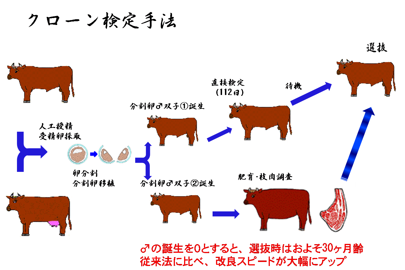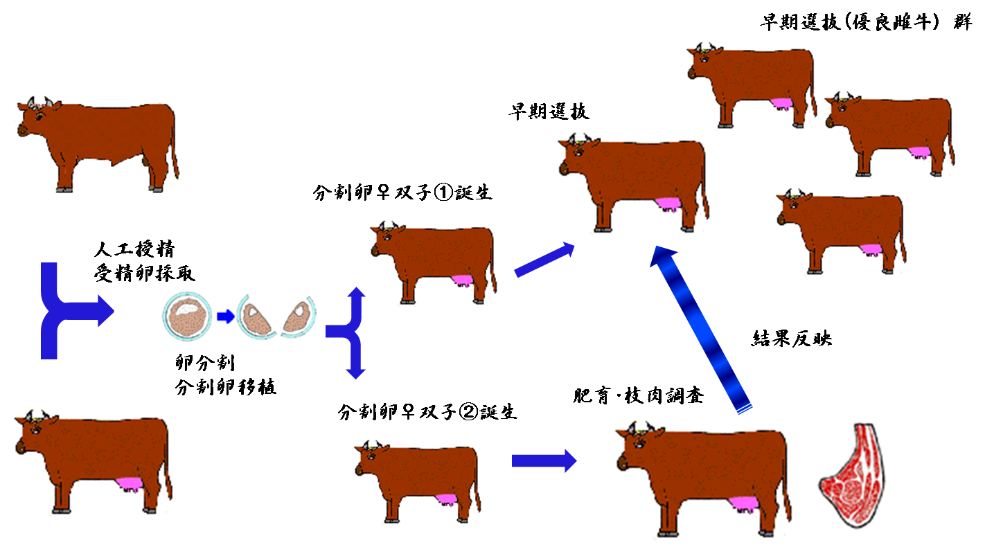 その方法は、2つに分割した受精卵から生まれた一卵性双子の一方を種雄牛候補として育成し、他方を去勢・肥育・と殺して肉を調査し、その成績から種雄牛候補として育成していた牛の能力を推定しようとするものです。