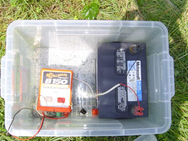 電牧器:電気を発生させる装置です。ソーラーパネルから電源を取るものや、バッテリーから電源をとるものなどがあります。鳥取牧場ではバッテリーから電源を取っています。