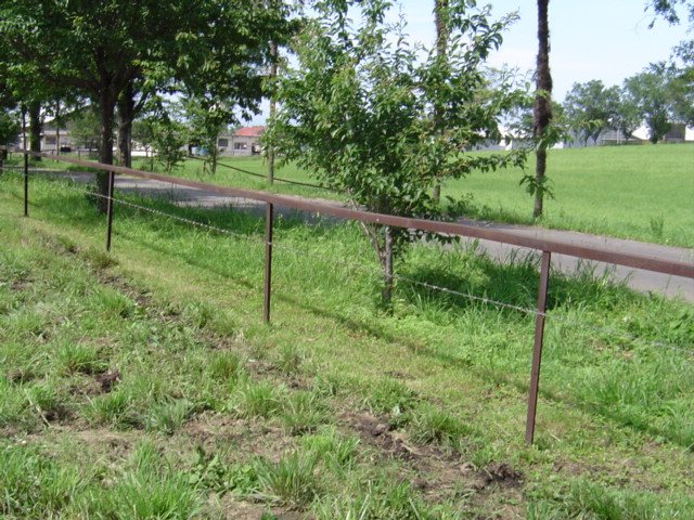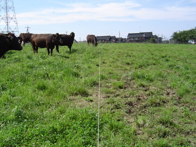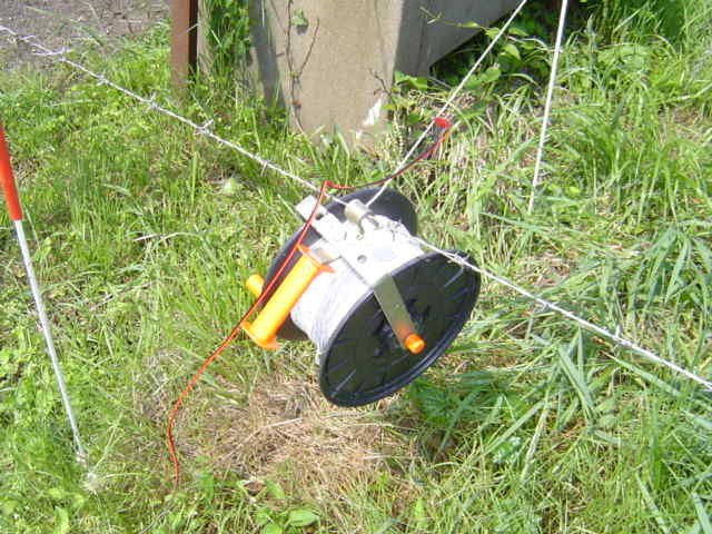 電牧線:この線を伝わって電気が流れていきます。人間が触れると、静電気よりも大きな衝撃が伝わってきて思わず手を引っ込めるほどの強さです。