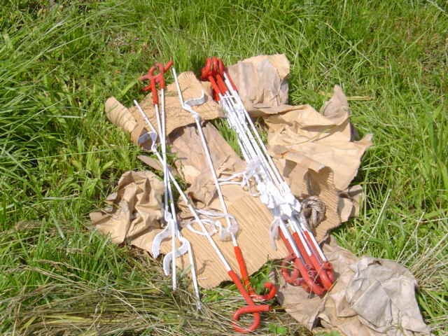 電牧柱:絶縁体の部分に電牧線を通して、電牧線を支えます。足で踏み込んで地中に打ち込めるようになっています。