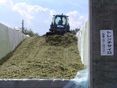 イタリアンライグラスの後作として、栽培しています。調製方法はトレンチサイロ貯蔵とラップフィルム包装による調製を行っています。10a当たりの年間収量は約4,500kg(水分75%換算)となっています。アワノメイガによる食害が多く、思ったように収量が伸びない状態です。飼料用トウモロコシで使える殺虫剤が開発されることで収量が伸びると思われます。